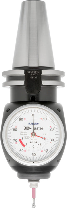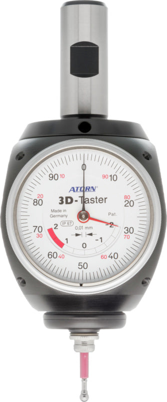 Vhodné pro definování a stanovení referenčních bodů obrobku ve všech 3 osách (X, Y a Z) na všech frézovacích strojích a obráběcích centrech. Obrobek je změřen měřicím dotykovou sondou v libovolném směru, až oba ukazatele ukazují „0“.