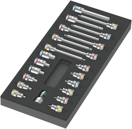 21 nástrčných bitů Wera 3/8" a 1 adaptér Zyklop s rychlovýměnným upínacím pouzdrem pro ¼" bity.