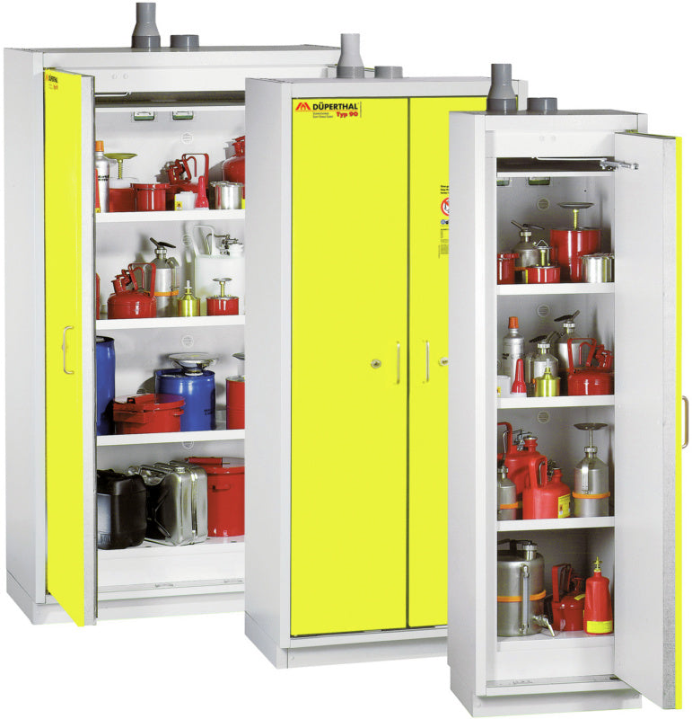 Pro bezpečné a předpisové uskladnění nebezpečných materiálů a hořlavých kapalin v pracovních prostorách v souladu s normami TRGS 510, DIN EN 14470-1 a DIN EN 14727.