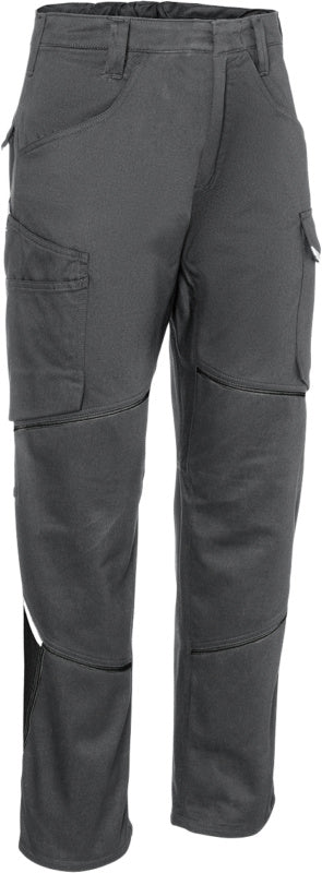 2 postranní kapsy s velkým otvorem, pravá multifunkční kapsa s volnou kapsou pro metr, kapsa na smartphone, další kapsy na pero, zadní kapsa s klopou a skrytým zapínáním na patentky, levá volná stehenní kapsa s klopou a skrytým zapínáním na patentky a kapsa na smartphone ve stehenní kapse