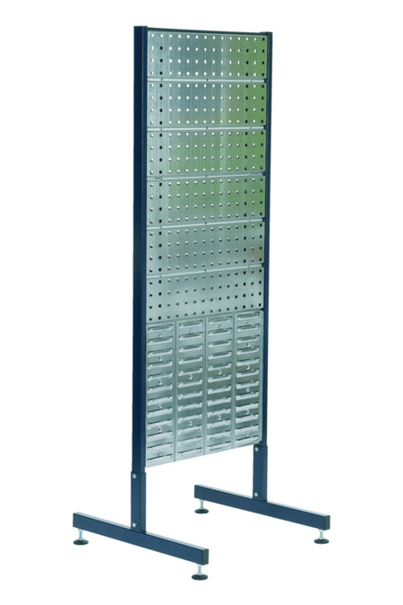 Dvojitý regál se čtyřmi děrovanými panely pro systém SuperClip a 2 štěrbinovými panely pro přehledné krabice pro systém SuperClip. Dodává se bez koleček, madel a systému SuperClip (k dispozici jako příslušenství)