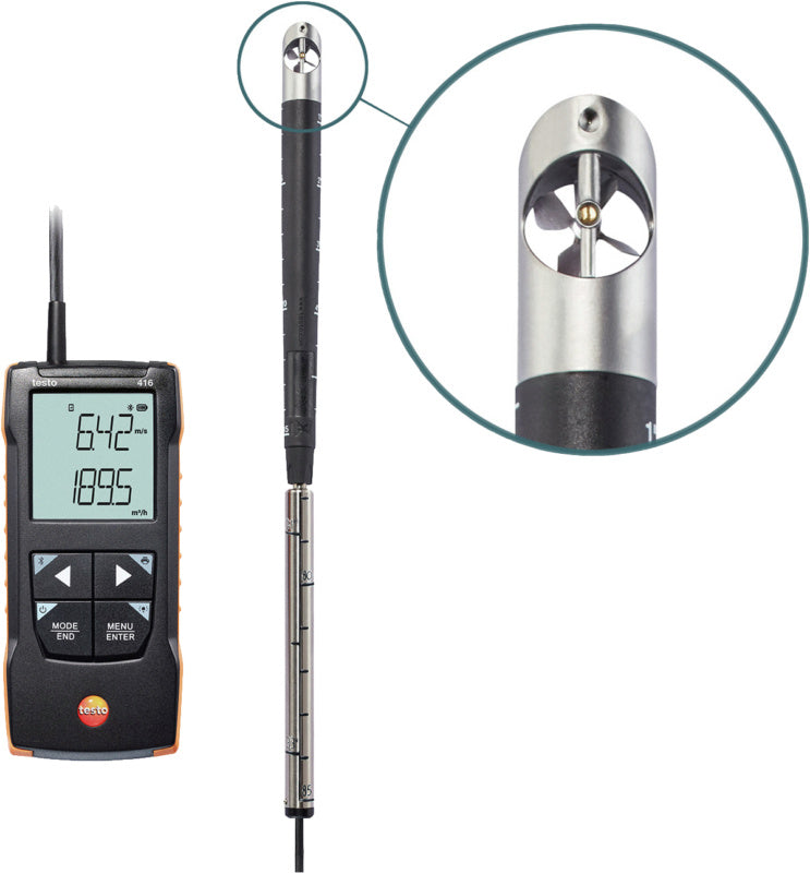 Anemometr s oběžným kolem a trvale připojeným výsuvným teleskopickým snímačem – ideální pro měření průtoku a výpočty objemu průtoku ve ventilačních šachtách.
