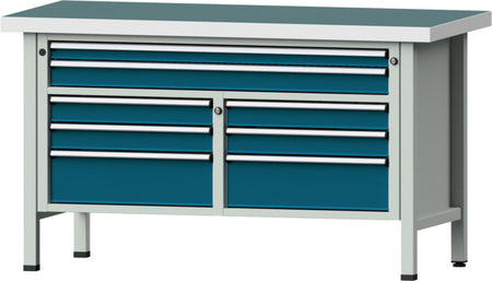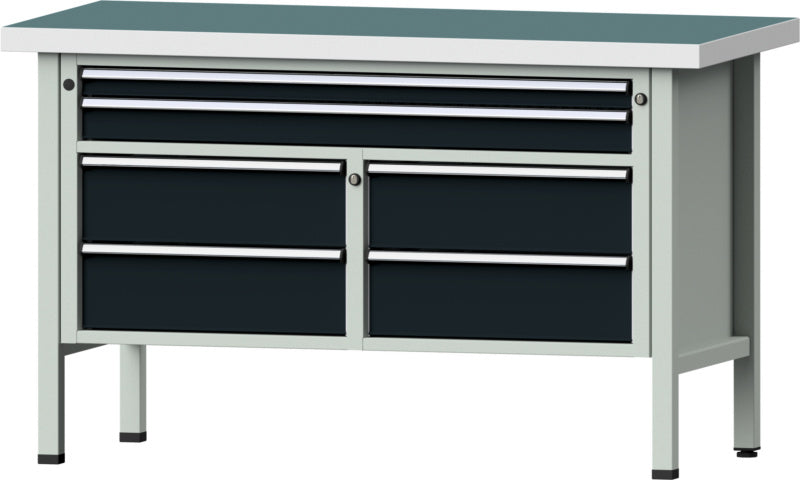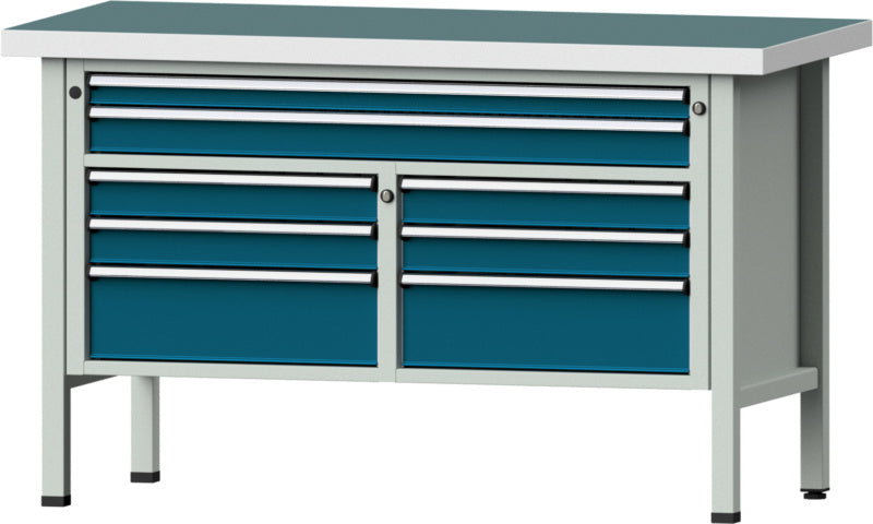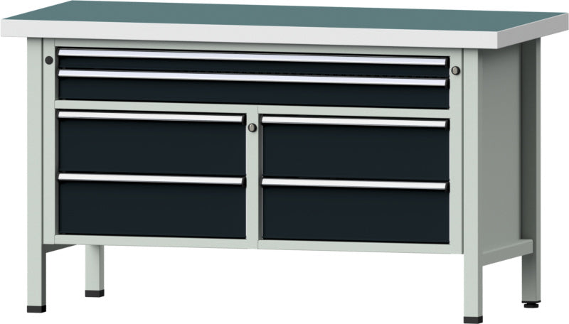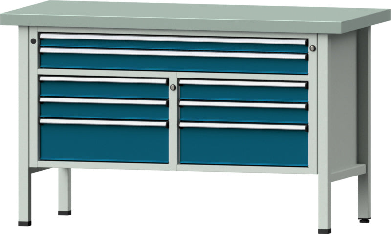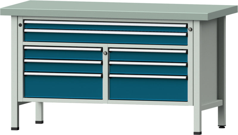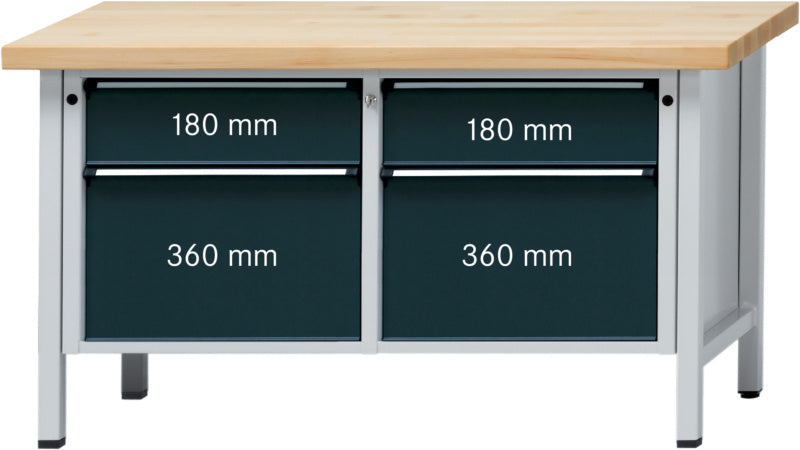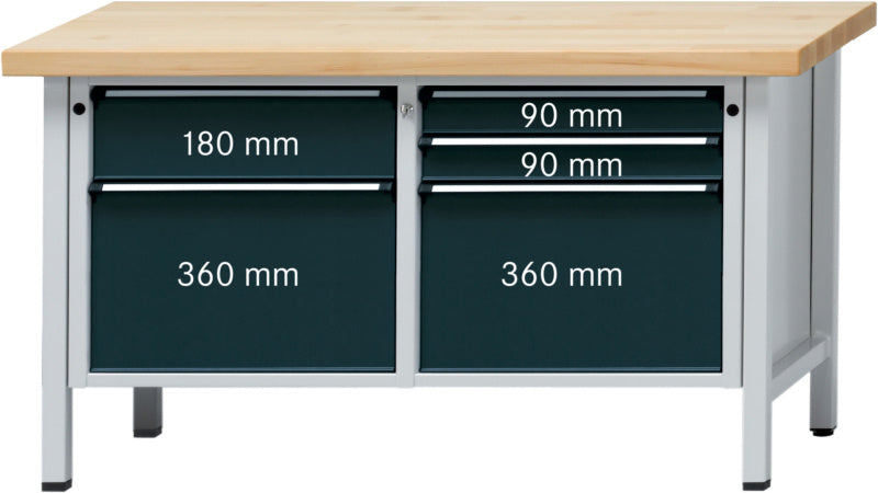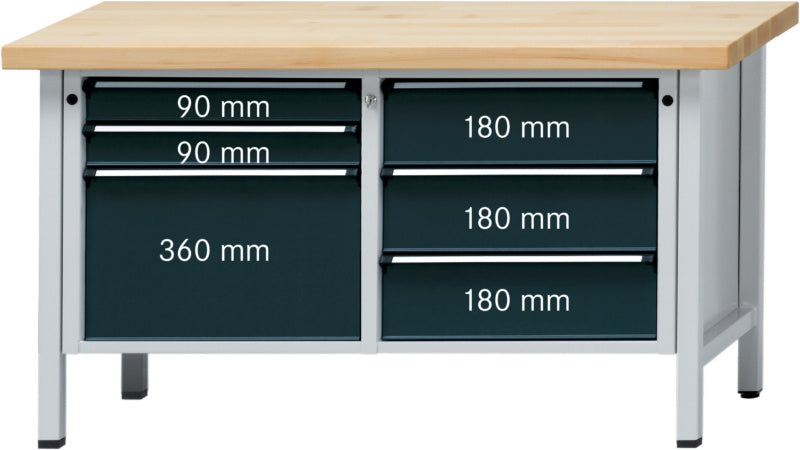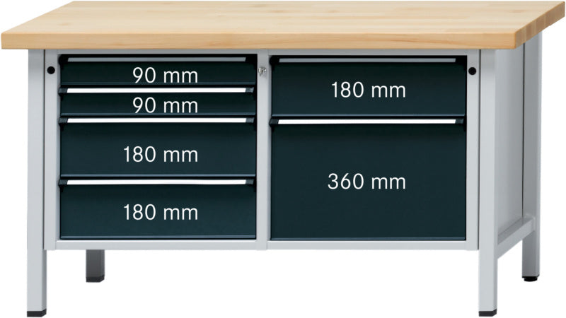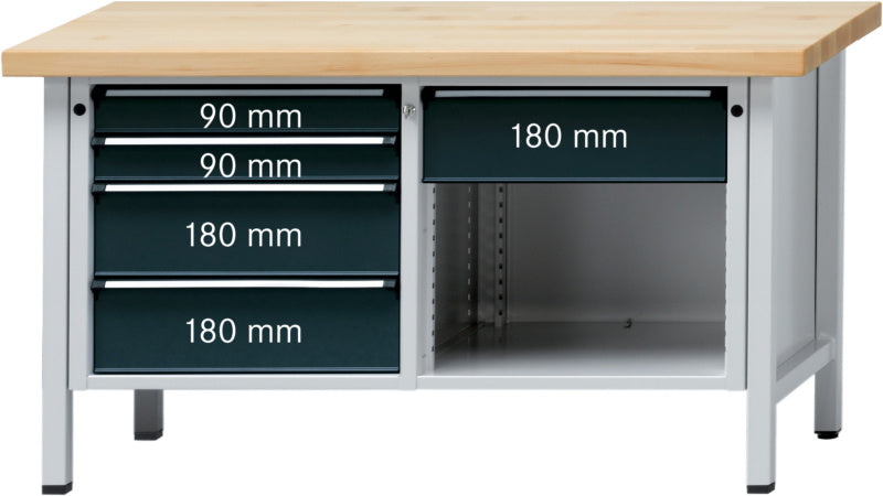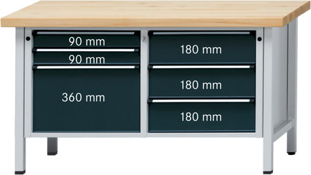 Nahoře 1x dlouhá zásuvka, šířka celé skříně s čelní výškou 150 mm, vlevo 3 zásuvky s 2x čelní výškou 90 mm a 1x čelní výškou 180 mm, vpravo 1x zásuvka s čelní výškou 360 mm
