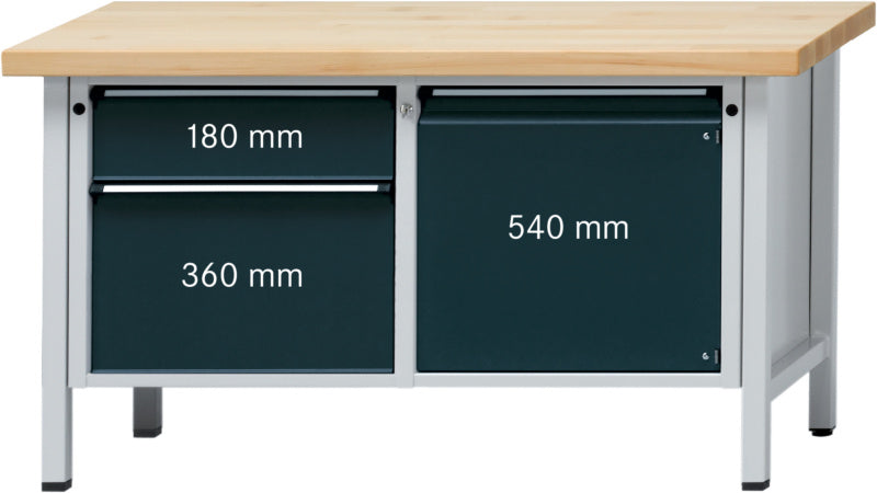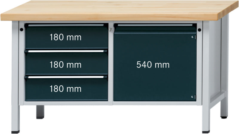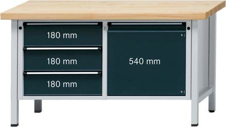3 zásuvky s plným vysunutím vlevo, 3x výška čela 180 mm, 1 dveře o výšce 540 mm vpravo
