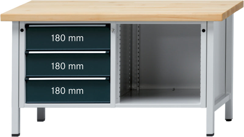 3 zásuvky s plným vysunutím vlevo, 3x výška čela 180 mm, 1 otevřená přihrádka vpravo