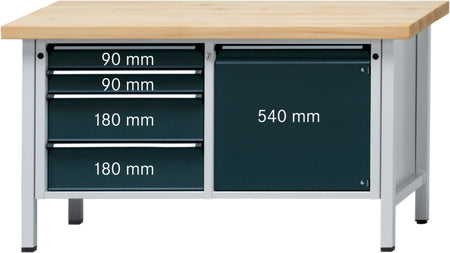 4 zásuvky s plným vysunutím vlevo, 2x výška čela 90 mm, 2x výška čela 180 mm, 1 dveře o výšce 540 mm vpravo