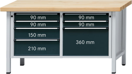 4 zásuvky s plným vysunutím vlevo, 2x výška čela 90 mm, 1x výška čela 150 mm, 1x výška čela 210 mm, 3 zásuvky vpravo, 2x výška čela 90 mm, 1x výška čela 360 mm