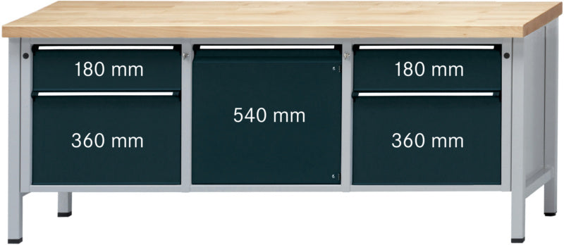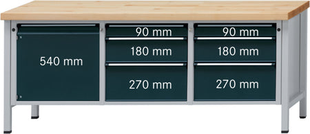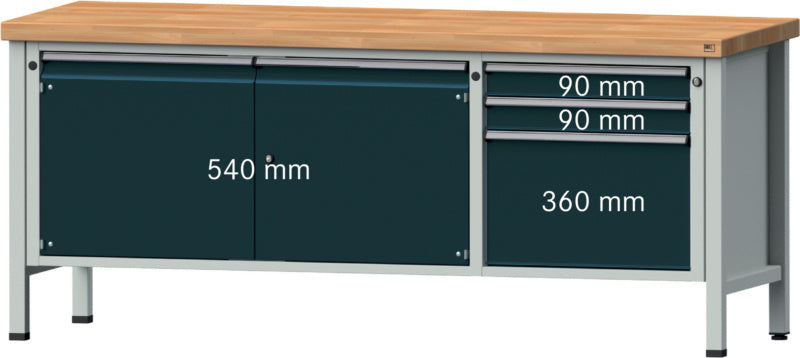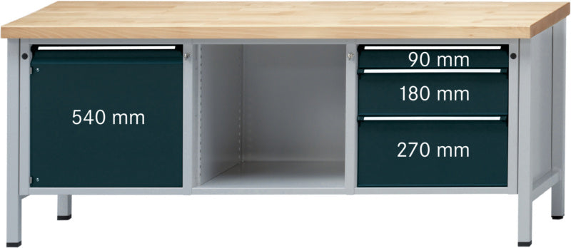 1 dveře o výšce 540 mm vlevo, 3 zásuvky s plným vysunutím uprostřed a vpravo, 1x výška čela 90 mm, 1x výška čela 180 mm, 1x výška čela 270 mm