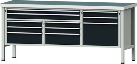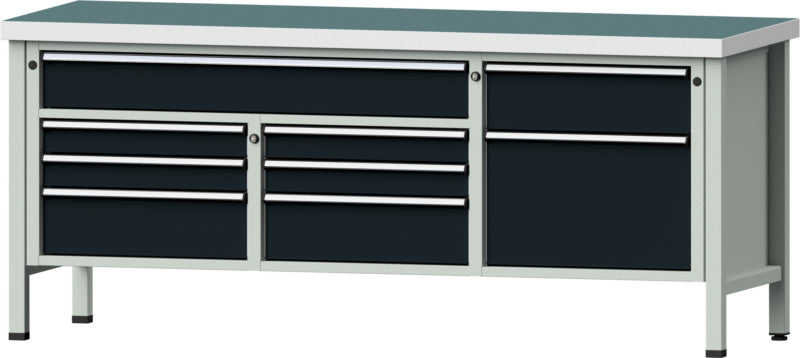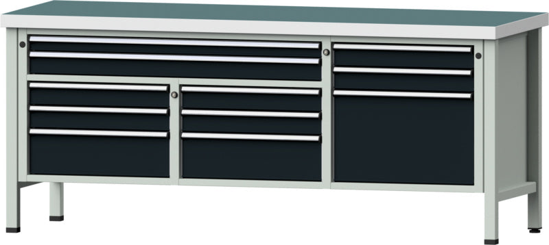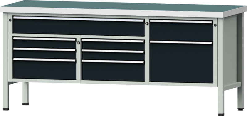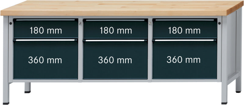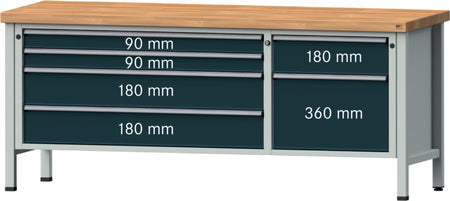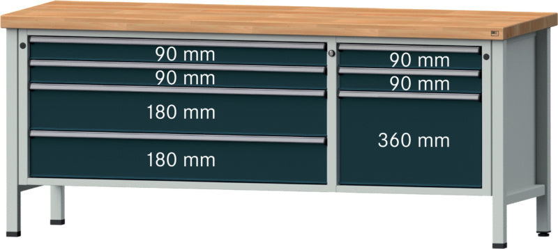 Nahoře 1 dlouhá zásuvka přes 2/3 šířky těla s přední výškou 150 mm, 3 zásuvky, každá na levé straně a ve středu, 2x přední výška 90 mm a 1x přední výška 180 mm, vpravo 2 zásuvky, 1x přední výška 180 mm a 1x přední výška 360 mm