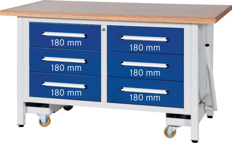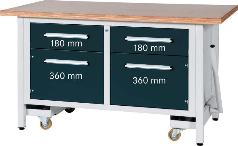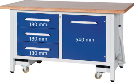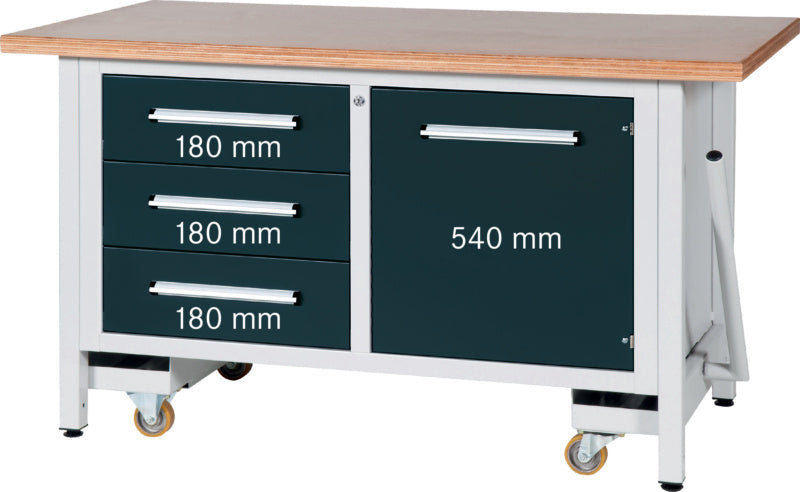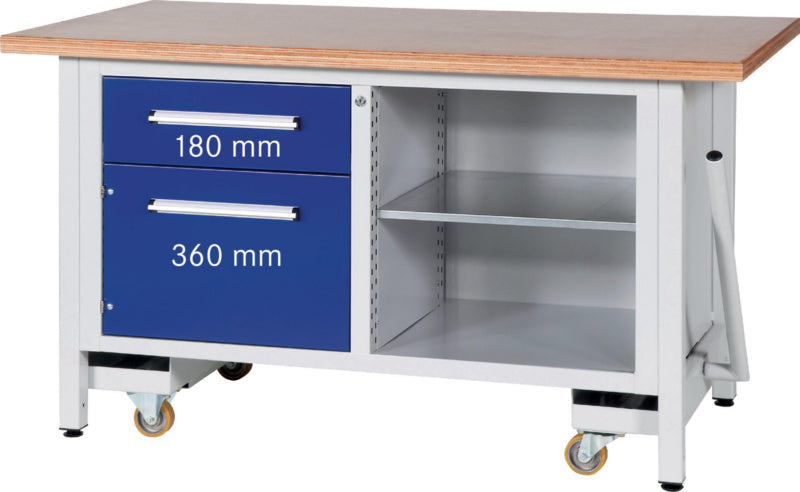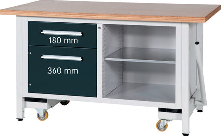 Dílenský stůl se skříňkou řady L 1500, se sklápěcím pojízdným zařízením