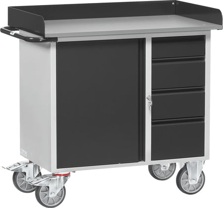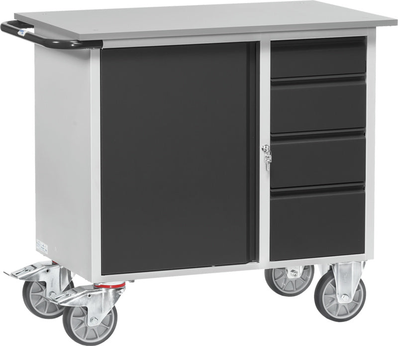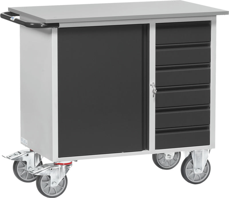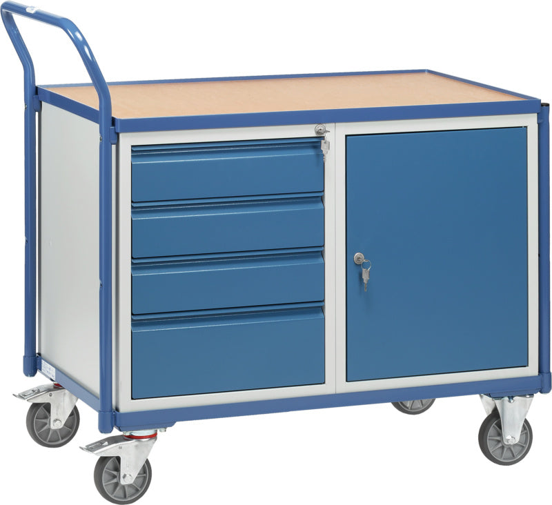 Dílenský vozík s 1 uzavřenou skříní s křídlovými dveřmi a 1 zásuvkovou skříní