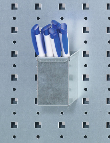 Pro zasunutí do desky z děrovaného plechu pracovního ostrůvku ABI nebo do stěny se čtvercovým děrováním 10 x 10 mm se vzdáleností mezi středy otvorů 38 mm, pro ukládání psacích potřeb.