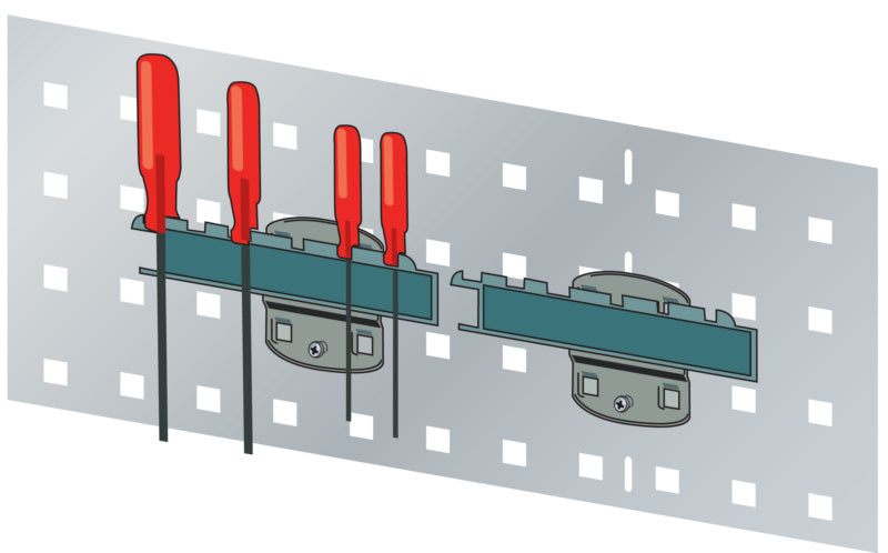 Háčky perforované desky musejí být zajištěny dodaným montážním materiálem. Barva držáků: Hliníková bílá RAL 9006.