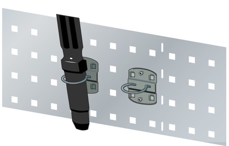Háčky perforované desky musejí být zajištěny dodaným montážním materiálem. Barva držáků: bílý hliník, RAL 9006.