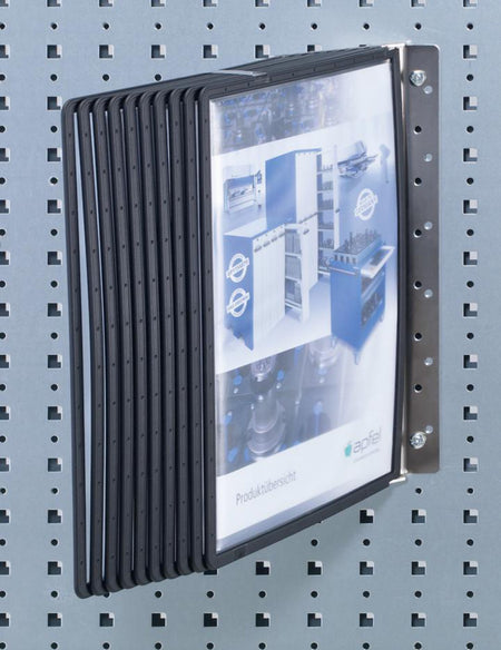 Pro našroubování do děrovaných plechů pracovního ostrůvku ABI Závěsný systém bez použití nářadí s ocelovými čepy pro snadnou výměnu a přehledné uspořádání dokumentů na pracovišti.