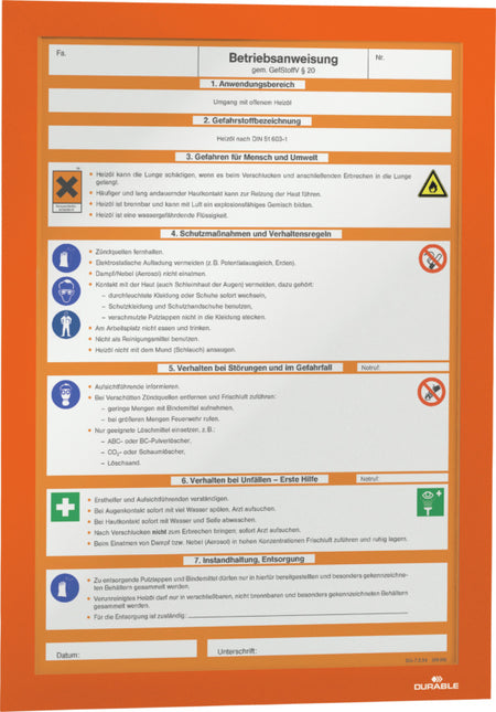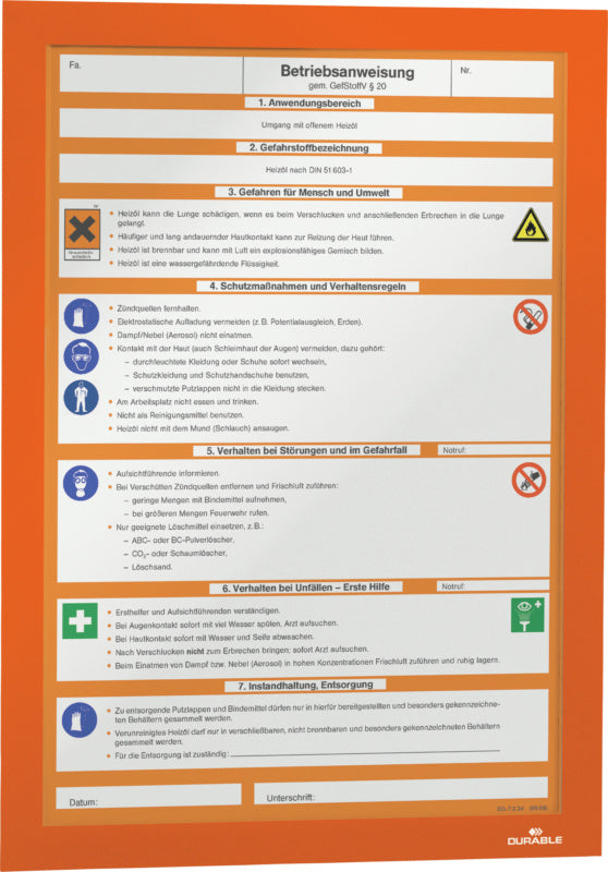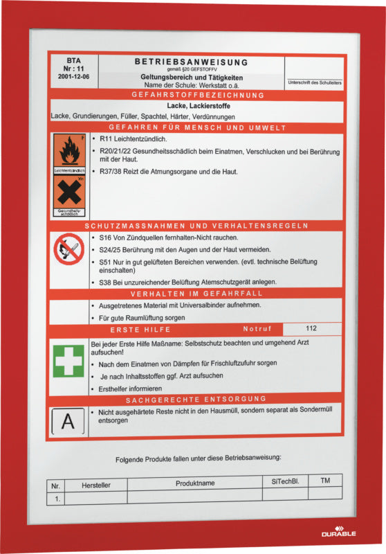 Ideální na poplašné plány (červená), varovná a bezpečnostní upozornění (červená), strojní a provozní pokyny (modrá), předpisy o nebezpečných materiálech (oranžová), technické výkresy a seznamy součástí. Možnost čtení z obou stran na skleněném povrchu díky průhledné podkladní fólii.