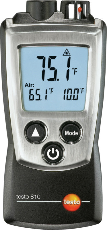 Infračervený teploměr testo 810 s integrovaným snímačem teploty NTC včetně ochranného krytu, kalibračního protokolu, pouzdra na opasek a baterií.