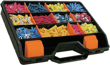 Velká sada se 600 izolovanými kroužky a kolíkovými svorkami, tupými konektory a zásuvnými nožovými konektory od 0,5 do 6 mm², různé