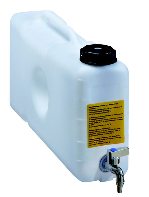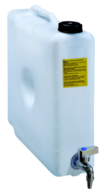 Nádoba s kohoutkem: Opatřena krytem šroubů Sítko v plnicím hrdle. Kohout, leskle chromovaný, s těsněním. Verze: HDPE plast, průhledná.