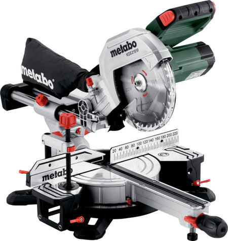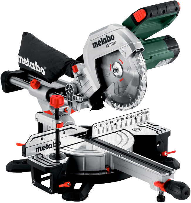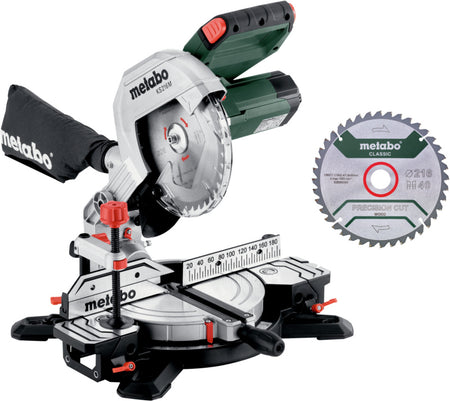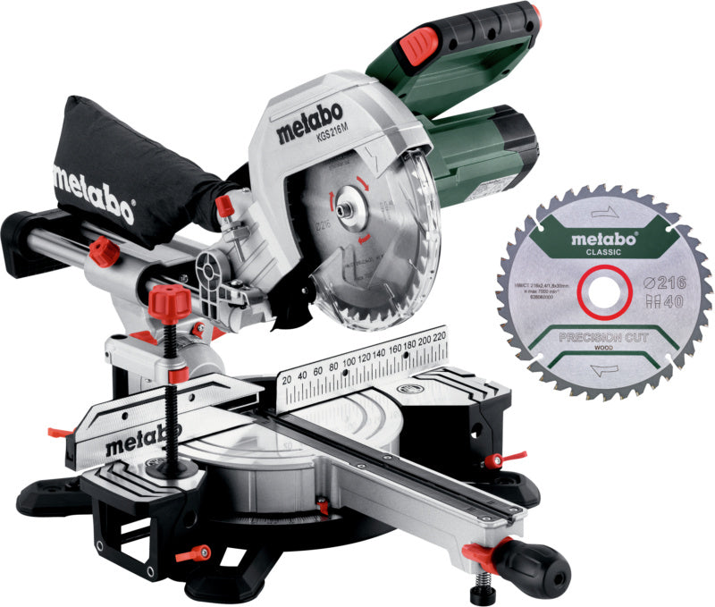 SKU: 71181200, Rozsah dodávky: „Přesné řezání dřeva – klasický“ pilový list 216×30 T=40, 2× integrovaný nástavec pro rozšíření stolu, nastavitelný doraz, svorka na materiál, nástroj pro výměnu pilového listu, sáček na piliny