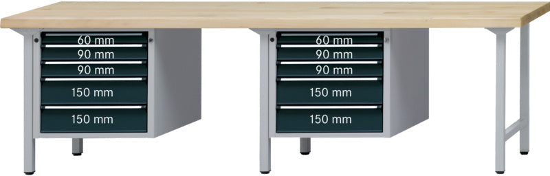 Na každém pracovišti 5 zásuvek se 100% plným vysunutím, 1x výška čela 60 mm, 2x výška čela 90 mm, 2x výška čela 150 mm