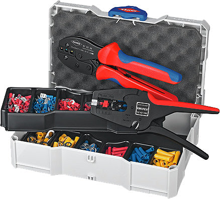 Sada s krimpovacím nástrojem na kabelové konektory pro automatické odizolovací kleště