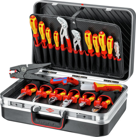 1x Slim VDE plochý šroubovák: 2,5/4,0/5,5/6,5/PH 1+2/PZ 1+2 / 1x jednopólová zkoušečka napětí / 1x odizolovací kleště ErgoStrip / 1x samonastavitelné odizolovací kleště / 1x siko kleště 180 mm / 1x kleště na vodní čerpadla Cobra 250 mm / 1x řezák na kabely / 1x štípací kleště na kabely s dvojitým břitem 200 mm / 1x štípací kleště VDE 160 mm, 1x štípací kleště pro velké zatížení 200 mm / 1x VDE úzké kleště přímé a zahnuté 200 mm / 1x VDE kombinované kleště 180 mm