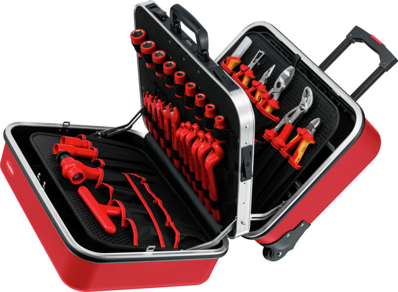 Robustní provedení, vyrobeno z materiálu ABS, červená barva. Vybaveno sadou nástrojů KNIPEX pro práci na elektrických zařízeních, testováno podle normy DIN EN/IEC 60900