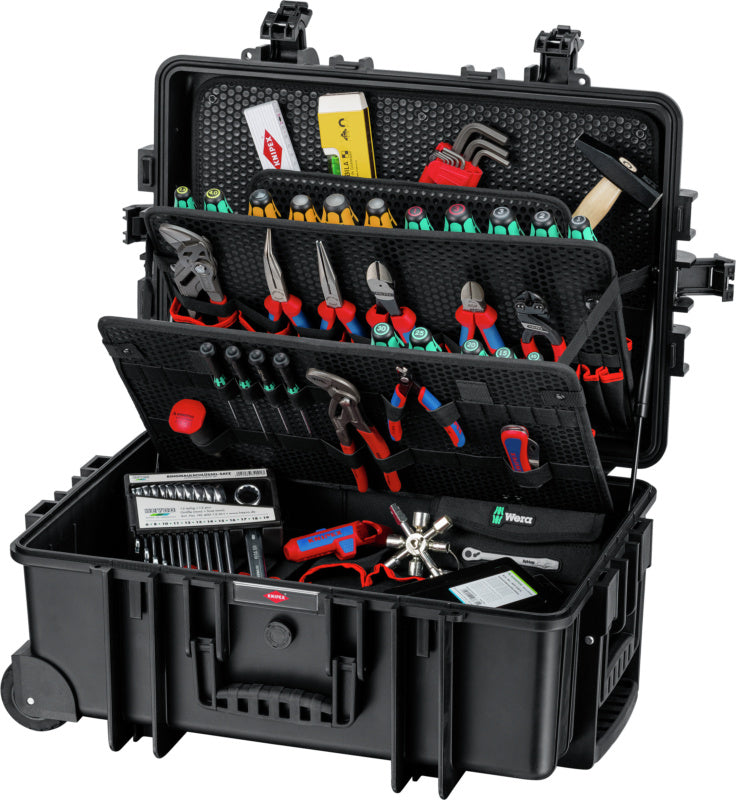 1x klíč TwinKey pro rozvaděče / 1x štípací kleště pro velké zatížení 200 mm, 1x štípací kleště 160 mm, 1x úzké kleště přímé a zahnuté 200 mm / 1x odizolovací kleště, 1x šroubovák PH 1/2/3, PZ 1/2/3, 4x plochý šroubovák, 5x TX / 2x mikro-šroubovák / 1x univerzální odizolovací kleště ErgoStrip, 1x Super Knips XL / 1x kleště na vodní čerpadla Cobra 250 mm, 1x siko kleště 250 mm / 1x štípací kleště na šrouby CoBolt 200 mm / 1x sada kombinovaných klíčů AF 6–19 mm / 1x sada vyrážečů závlaček, 1x elektrikářský zavírací nůž / 1x vodováha typ 70 TM