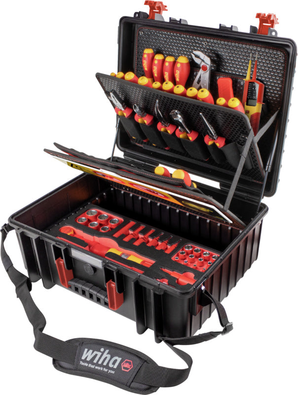 1x VDE šroubovák: plochý 3,5/4,0/5,5/6,5 křížový PH 1+2, TX 20/25/27/30/40 / 1x VDE nástrčný klíč 7/8/10/13 mm / 1x sada vyměnitelných čepelí Slim-Line s VDE momentovým šroubovákem / 1x VDE reverzibilní ráčna 3/8", nástavec 125 and 250 mm / 1x VDE nástrčný klíč 1/4" AF 4/5/6/7/8/9/10/11/12/13/14 mm / 1x VDE nástrčný klíč 3/8" AF 16/17/18/19/21/22 mm, long AF 8/10/12 mm / 1x VDE nástrčný klíč 1/4", vnitřní šestihran AF 4/6/8 mm, adaptér 3/8 na 1/4" / 1x tester obvodů/napětí / 1x zářivka s magnetem nastavitelná / 1x odizolovací nůž / 1x VDE štípací kleště, 1x kleště na vodní čerpadla, 1x štípací kleště na kabely, 1x kombinované kleště / 1x zahnuté VDE úzké kleště, 1x přímé ploché kleště / 1x VDE rukojeť s držákem bitů a 1x rukojeť s držákem bitů Stubby