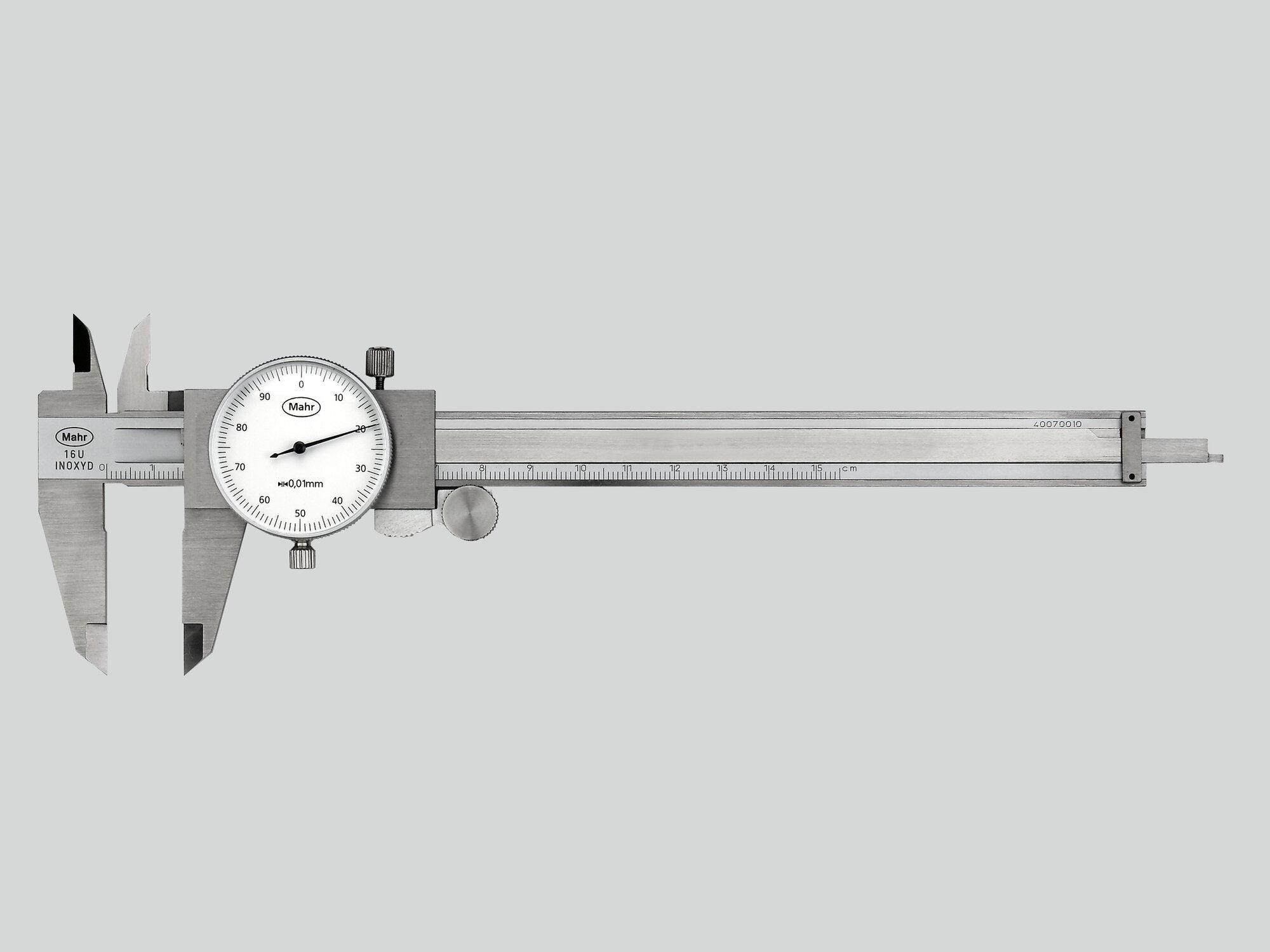 Posuvné měřítko s kruhovým číselníkem MarCal 16 U|Aretační šroub nahoře|Rozsah měření: 0 - 150 mm|Dělení stupnice mm: 0.01|Rozsah dodávky: Pouzdro