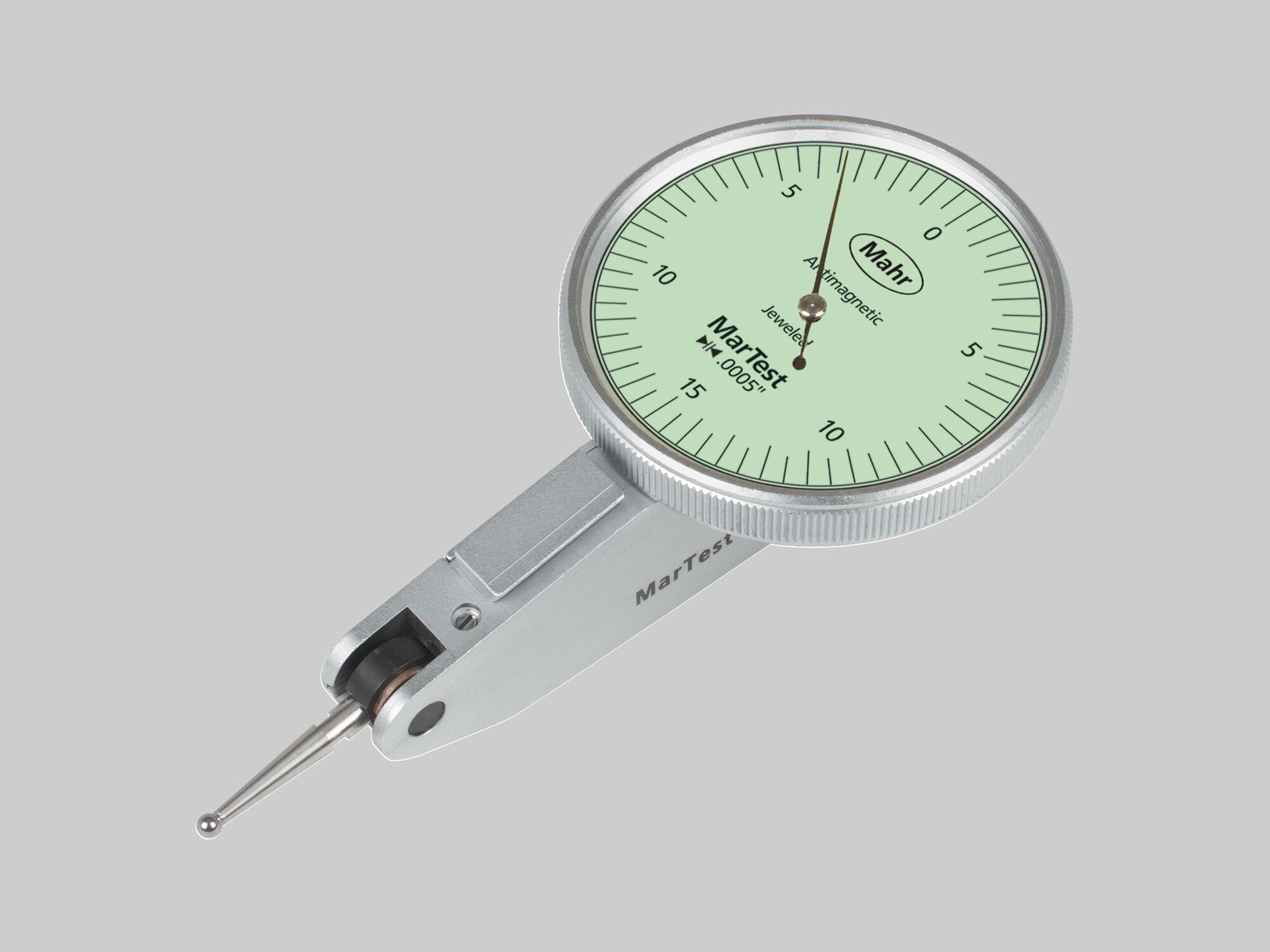 Páčkový úchylkoměr MarTest 801 SG| Tovární norma| Rozsah měření: ± 0,015" |Dělení stupnice inch: .0005"| Rozsah dodávky: Klíč k výměně měřicích vložek, Měřicí dotek ø 2 mm, Upínací stopka 800a3/8, Zkušební protokol, Návod k obsluze, Pouzdro