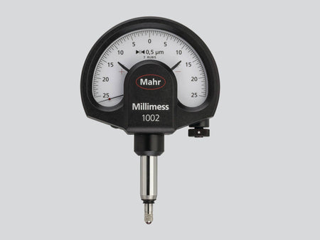 Přesné indikátory Millimess 1002|Tovární norma||Barva číselníku: Bílá| Rozsah měření, ± 25 µm| Dělení stupnice (µm): 0.5 µm|Měřicí síla: 1 N|Rozsah dodávky: Zkušební protokol, Pouzdro