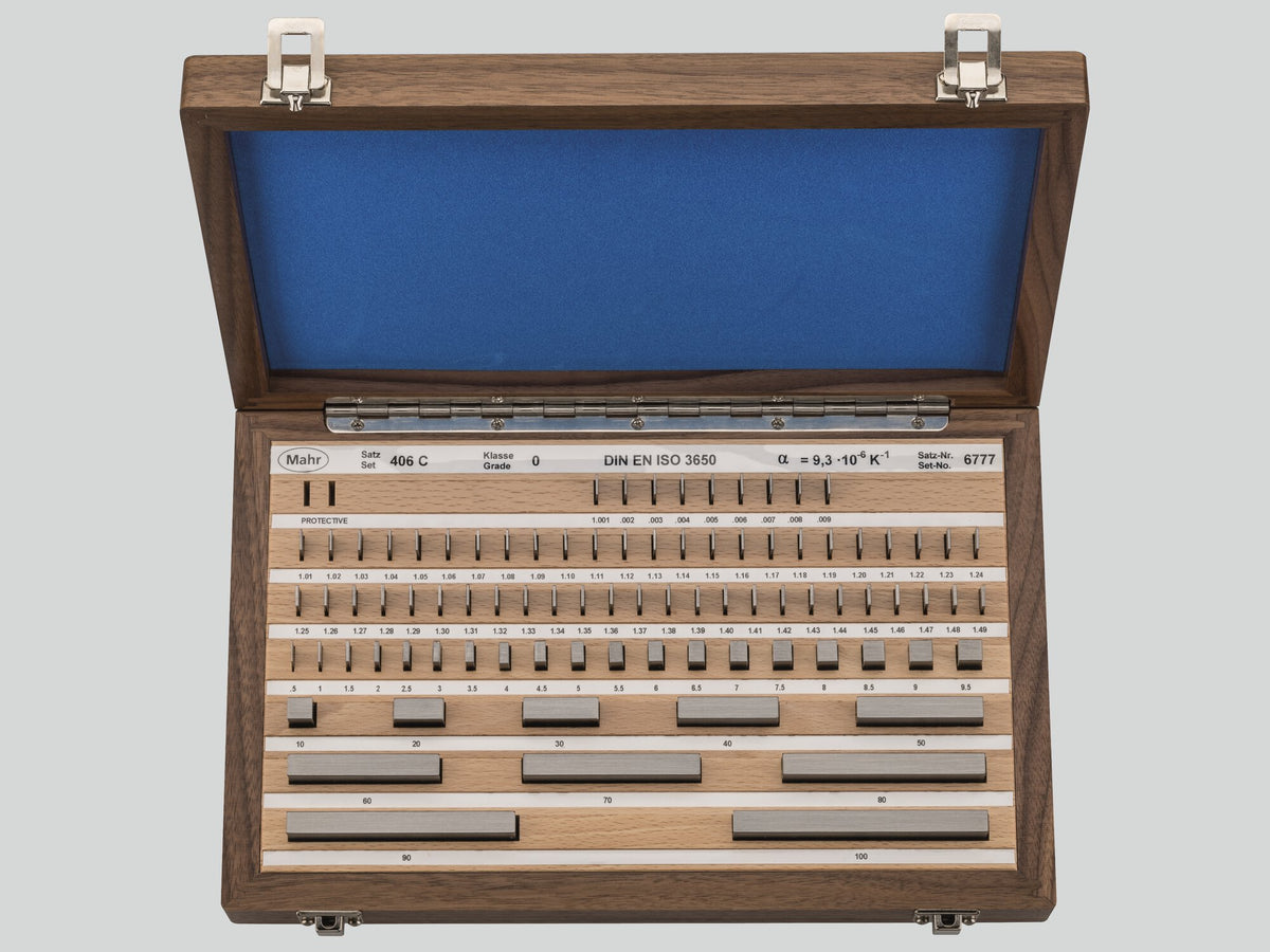 406 Sada ocelových koncových měrek|87 ks|Stupeň přesnosti: 1|DIN EN ISO 3650|Dřevěné pouzdro s přehlednými popiskami, Kalibrační certifikát Mahr
