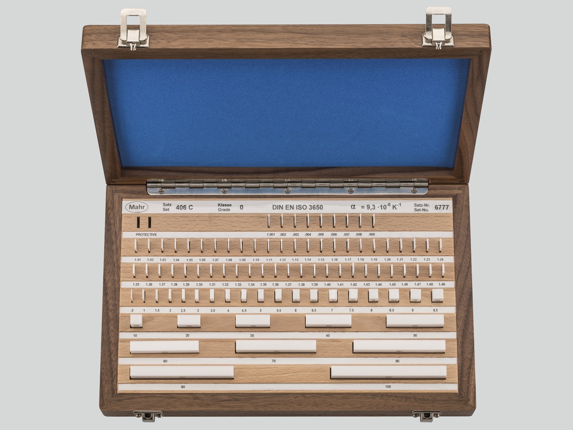 406 C Sada keramických koncových měrek|87 Pieces|Stupeň přesnosti: 2|DIN EN ISO 3650|Dřevěné pouzdro s přehlednými popiskami, Kalibrační certifikát Mahr