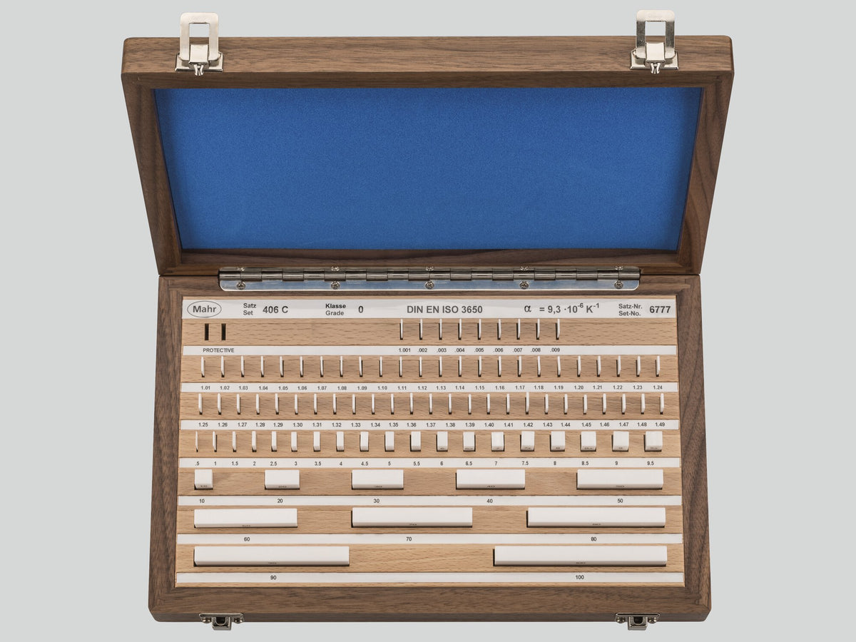 406 C Sada keramických koncových měrek|87 Pieces|Stupeň přesnosti: 1|DIN EN ISO 3650|Dřevěné pouzdro s přehlednými popiskami, Kalibrační certifikát Mahr