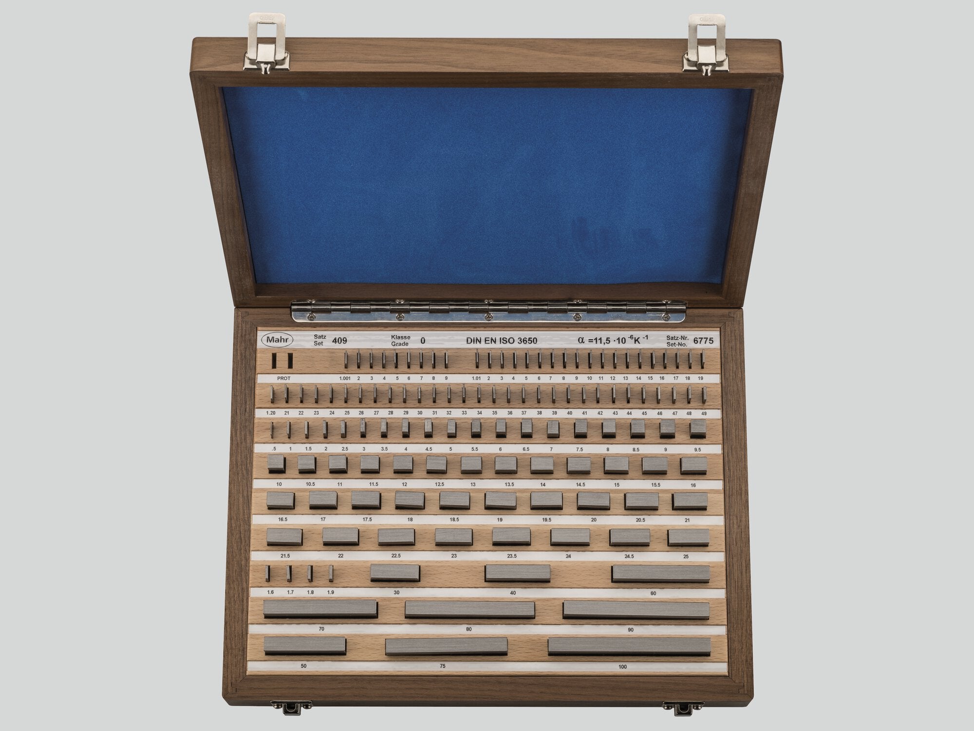 409 Sada ocelových koncových měrek|121 ks|Stupeň přesnosti: 2|DIN EN ISO 3650|Dřevěné pouzdro s přehlednými popiskami, Kalibrační certifikát Mahr