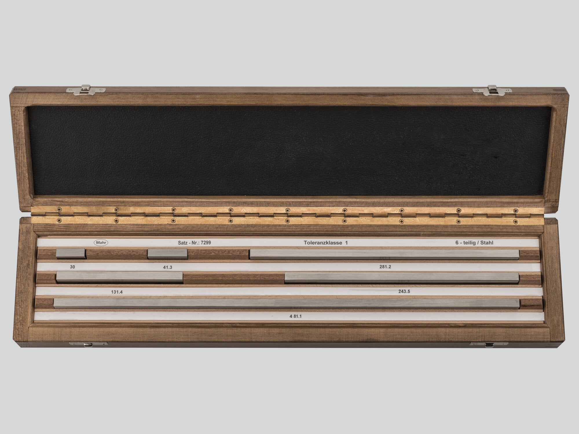 415 Sada ocelových koncových měrek|6 ks|Stupeň přesnosti: 1|DIN EN ISO 3650|Dřevěné pouzdro s přehlednými popiskami, Kalibrační certifikát Mahr