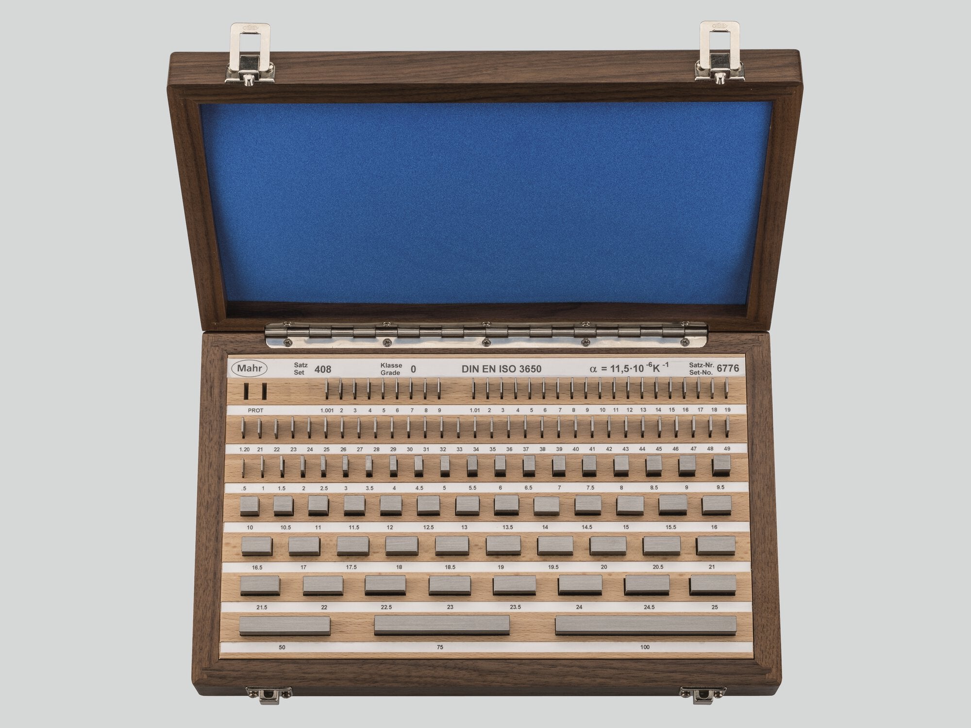 408/1/So Sada ocelových koncových měrek|112 Stück|Stupeň přesnosti: 1|DIN EN ISO 3650|Dřevěné pouzdro s přehlednými popiskami, Kalibrační certifikát Mahr