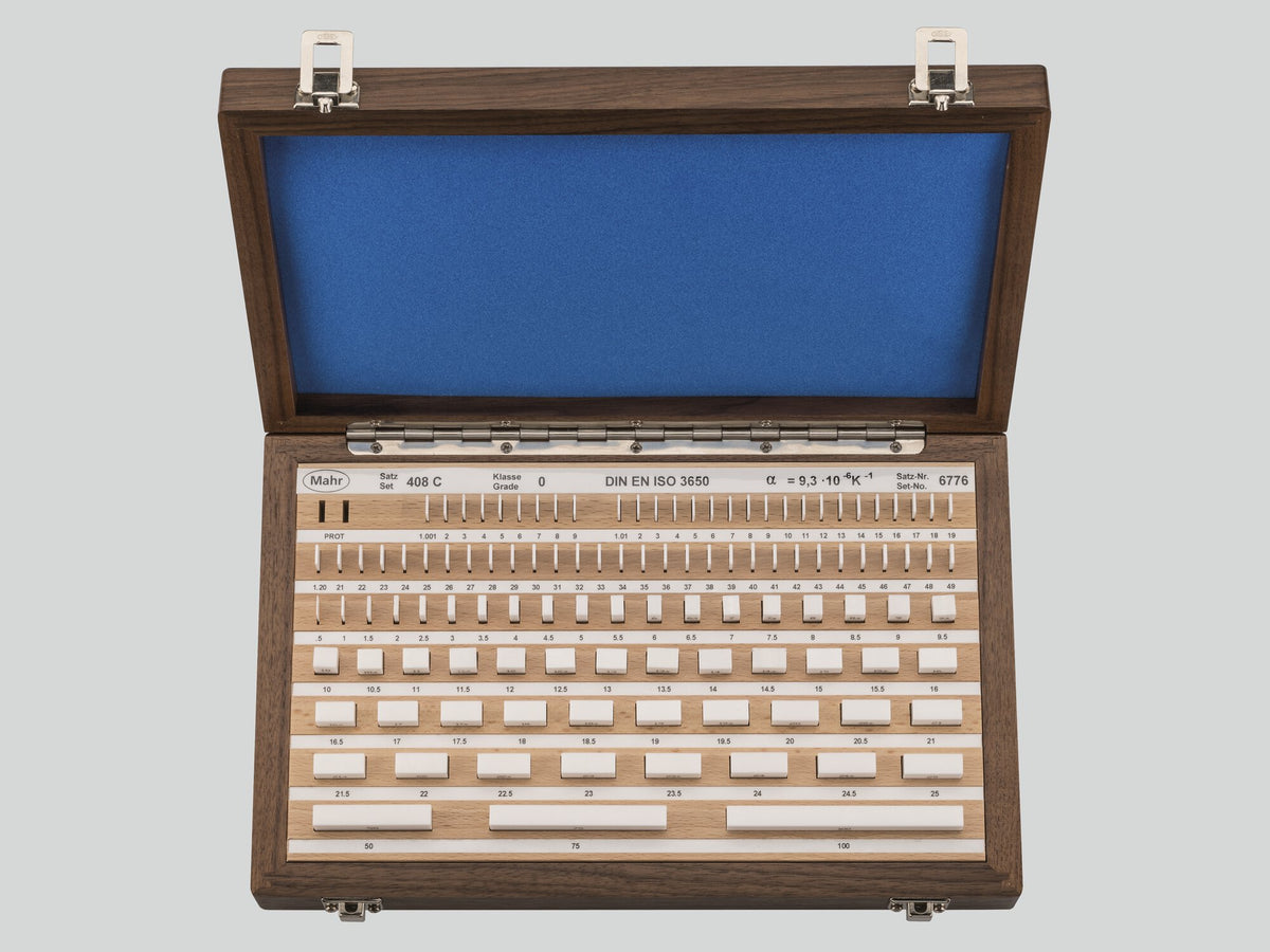 408 C/1/So Sada keramických koncových měrek|112 Stück|Stupeň přesnosti: 1|DIN EN ISO 3650|Dřevěné pouzdro s přehlednými popiskami, Kalibrační certifikát Mahr