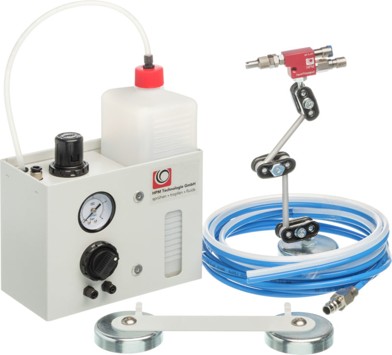 Základní jednotka, výkonná sprejová hlava HTRB050, magnetický držák pro sprejovou hlavu a základní jednotku, 1 litr obráběcího média SAMNOS ZM-21W, hadice 2 m ke sprejové hlavě, hadice 3 m pro přívod vzduchu