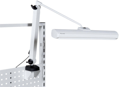 Pro instalaci kloubových svítidel na stěně z děrovaného plechu na konstrukci dílenského stolu.