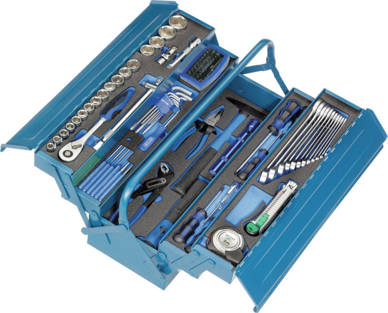 1x kombinovaný klíč 8/10/11/12/13/14/15/16/17/19/22/24 mm / 1x plochý šroubovák 4/5,5/6,5 mm / 1x křížový šroubovák PH 1/PH 2 / 1x úhlový šroubovák 1,5/2/2,5/3/4/5/6/8/10 mm / 1x box s bity – 32 ks s magnetickým držákem bitů a nasazovací rukojetí / 1x reverzibilní ráčna 1/2" / 1x nástavec 125 and 250 mm, kardanový kloub, 1/2" / 1x vnitřní šestihran 10/11/12/13/14/15/16/17/18/19/20/21/22/24/27/30/32 mm, 1/2" / 1x kombinované kleště 180 mm / 1x pracovní nůž 170 mm / 1x svinovací metr 5 m / 1x kleště na vodní čerpadla 250 mm / 1x kladivo s křížovým čelem 300 g, 1x palice 1000 g / 1x teleskopická LED svítilna 195–570 mm / 1x plochý klíč 255 mm / 1x štípací kleště 160 mm / 1x důlčík, vyrážeč závlaček 3 a 4 mm, průbojník 3 mm