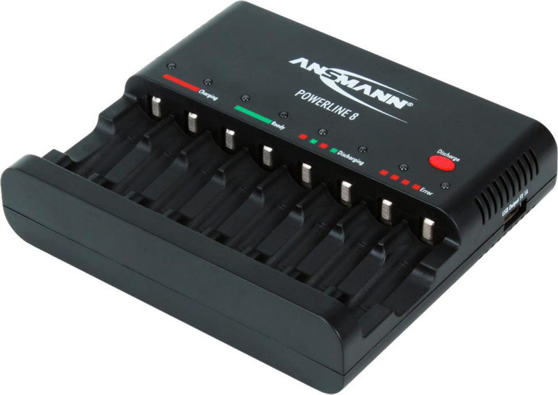 Stolní nabíječka na 1–8 baterií AAA nebo AA s nabíjecím výstupem USB. Doba nabíjení pro 1 000 mAh přibl. 140 min., LCD ukazatel nabití.