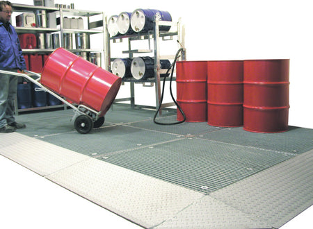 Posuvné ochranné vany pro skladování a plnění hořlavých kapalin v kategoriích GHS 1–3 a kapalin ohrožujících vody v kategoriích GHS 1–4.