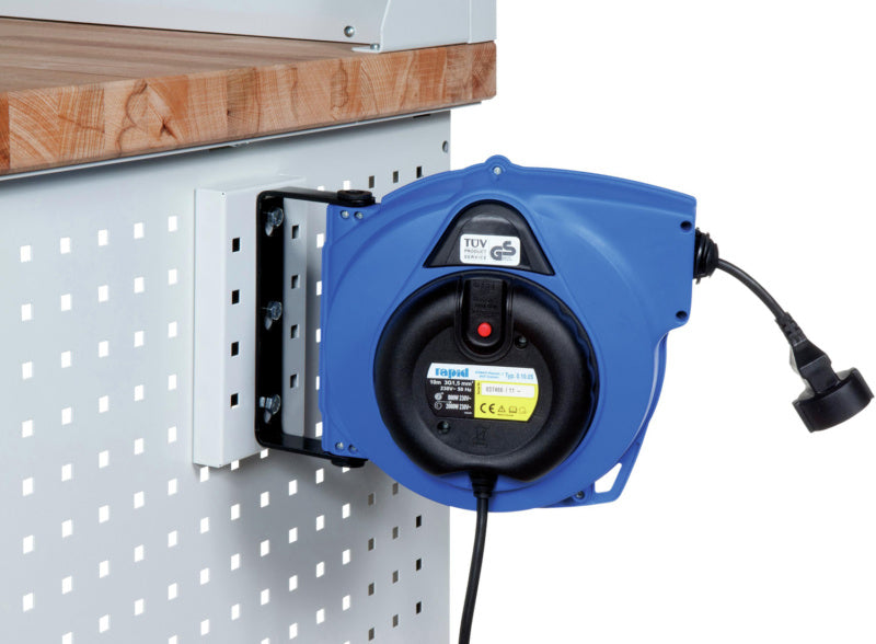 Pro montáž na stěny z děrovaného plechu, pro variabilní použití elektrických přístrojů na pracovišti díky flexibilnímu napájecímu kabelu.