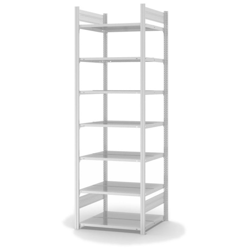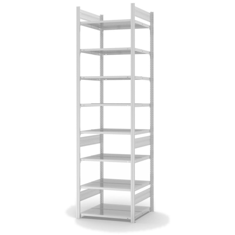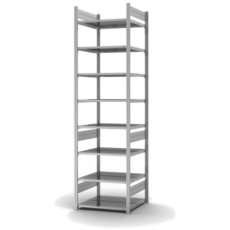 Vysoce kvalitní bezšroubový ocelový archivační regál pro ukládání složek. Zadní okraj zabraňuje vypadávání složek na druhé straně.