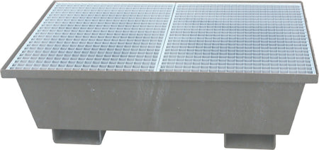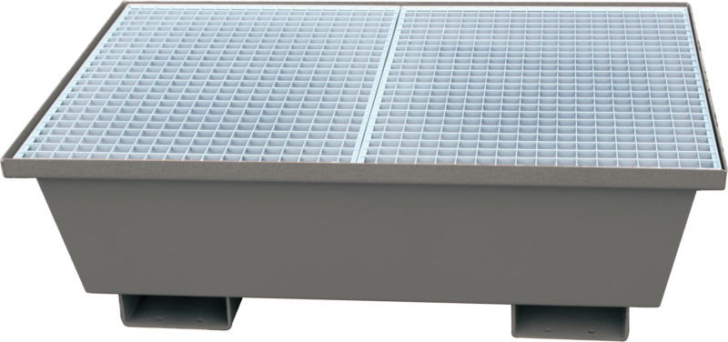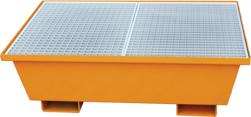 Zvláště hluboká vodotěsná a olejotěsná sběrná vana z oceli s kónickými bočními stěnami a robustními rošty. Nohy této robustní ocelové sběrné vany fungují jako kapsy pro přepravu vysokozdvižným vozíkem. Ocelová sběrná vana je k dispozici v různých velikostech a objemech.