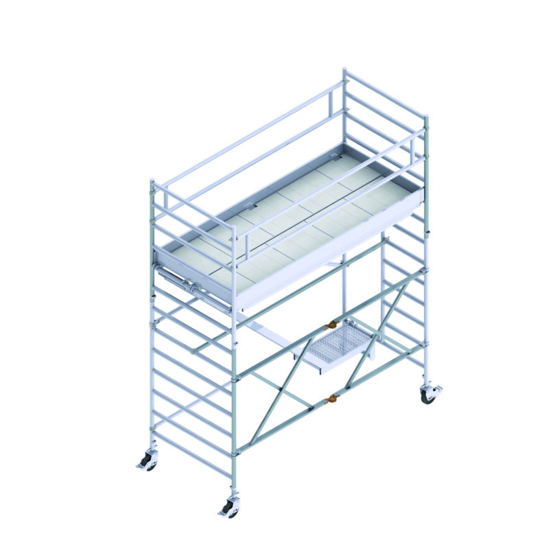 Příčle a povrchy plošiny z protiskluzové ocelové mřížky (R12) vhodné pro všechny povětrnostní podmínky. Mřížka s otvory také zabraňuje usazování nečistot, sněhu a vlhkosti na povrchu