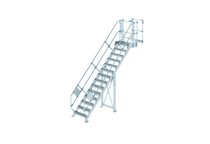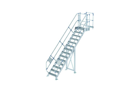 Pohodlný přístup na plošinu díky 45° schodišti se zábradlím na obou stranách a automaticky se zavírajícími bezpečnostními dvířky